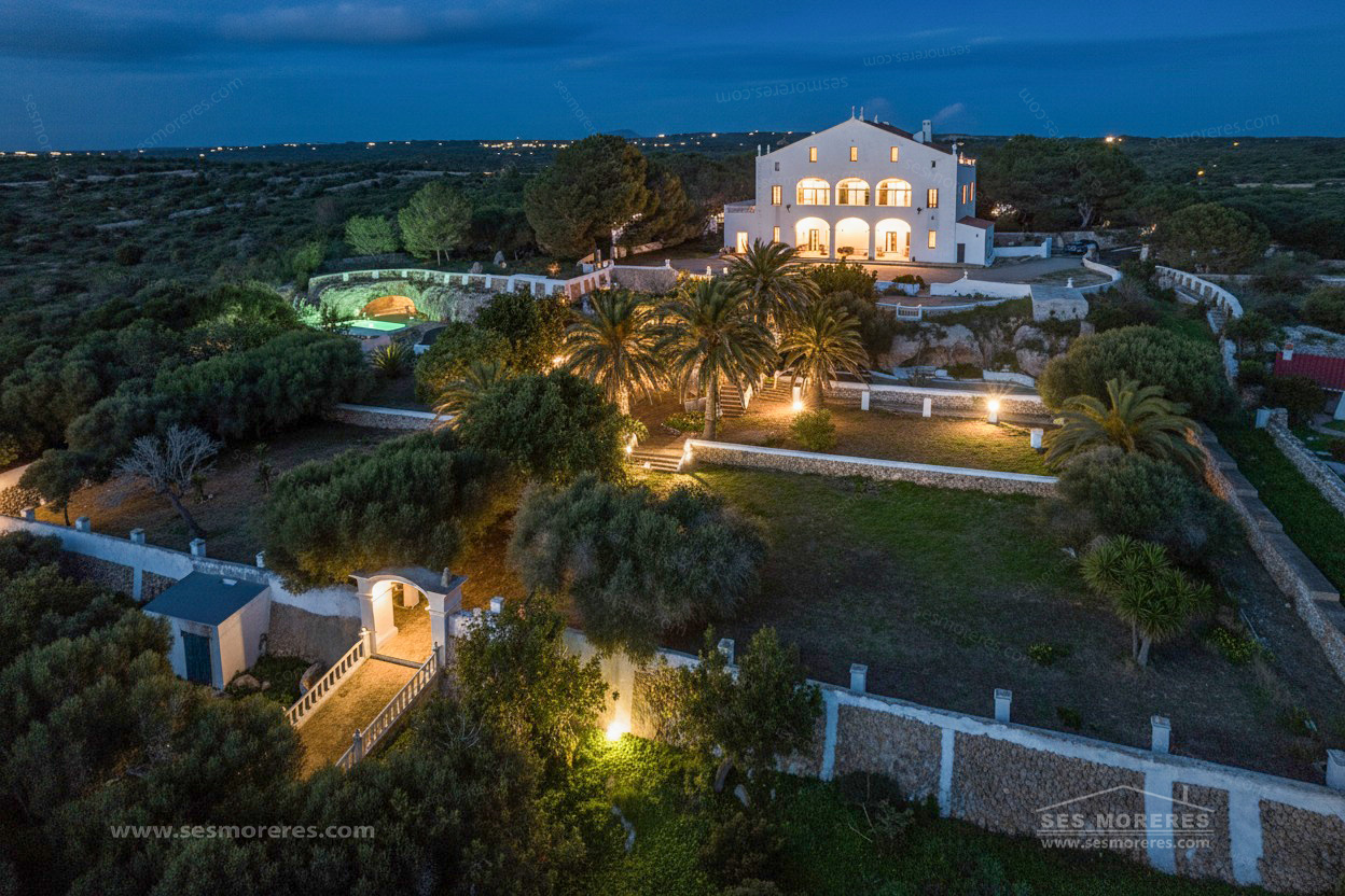 Ubicada en un entorno privilegiado, esta finca de 600.000 m² de terreno alberga una majestuosa casa señorial del siglo XVIII, que se alza imponente entre exuberantes jardines renacentistas y terrazas de piedra. Sus elegantes arcadas, su fachada blanca impoluta y su posición elevada ofrecen una panorámica incomparable del paisaje menorquín.