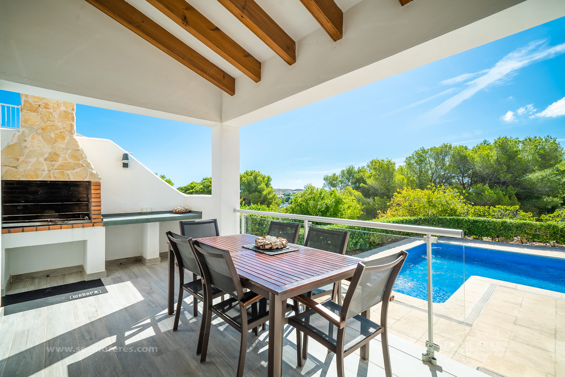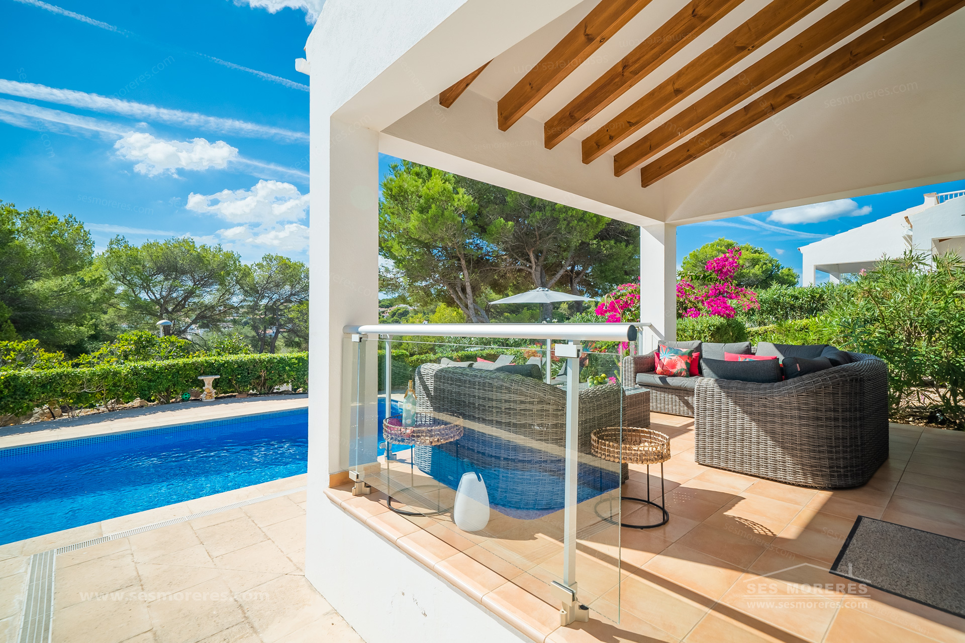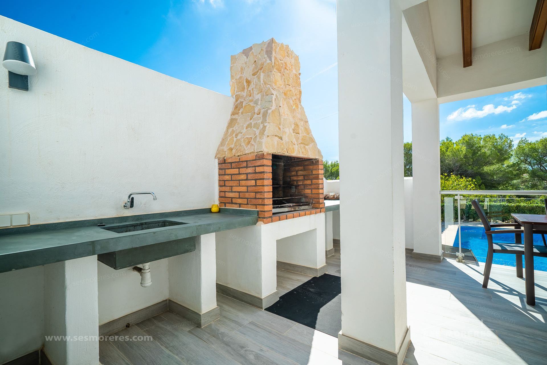 The exterior enjoys a pleasant patio, as well as a covered terrace, ideal for outdoor dining. From here, you can enjoy views of the private pool and the area of Port Addaia and Cala Molí. In this outdoor space, there is an ideal kitchen/barbecue area for enjoying pleasant family evenings. The gardens filled with native and low-maintenance plants complete the atmosphere of privacy and relaxation.