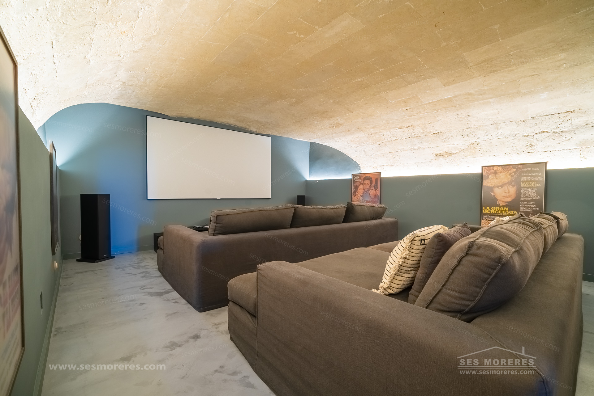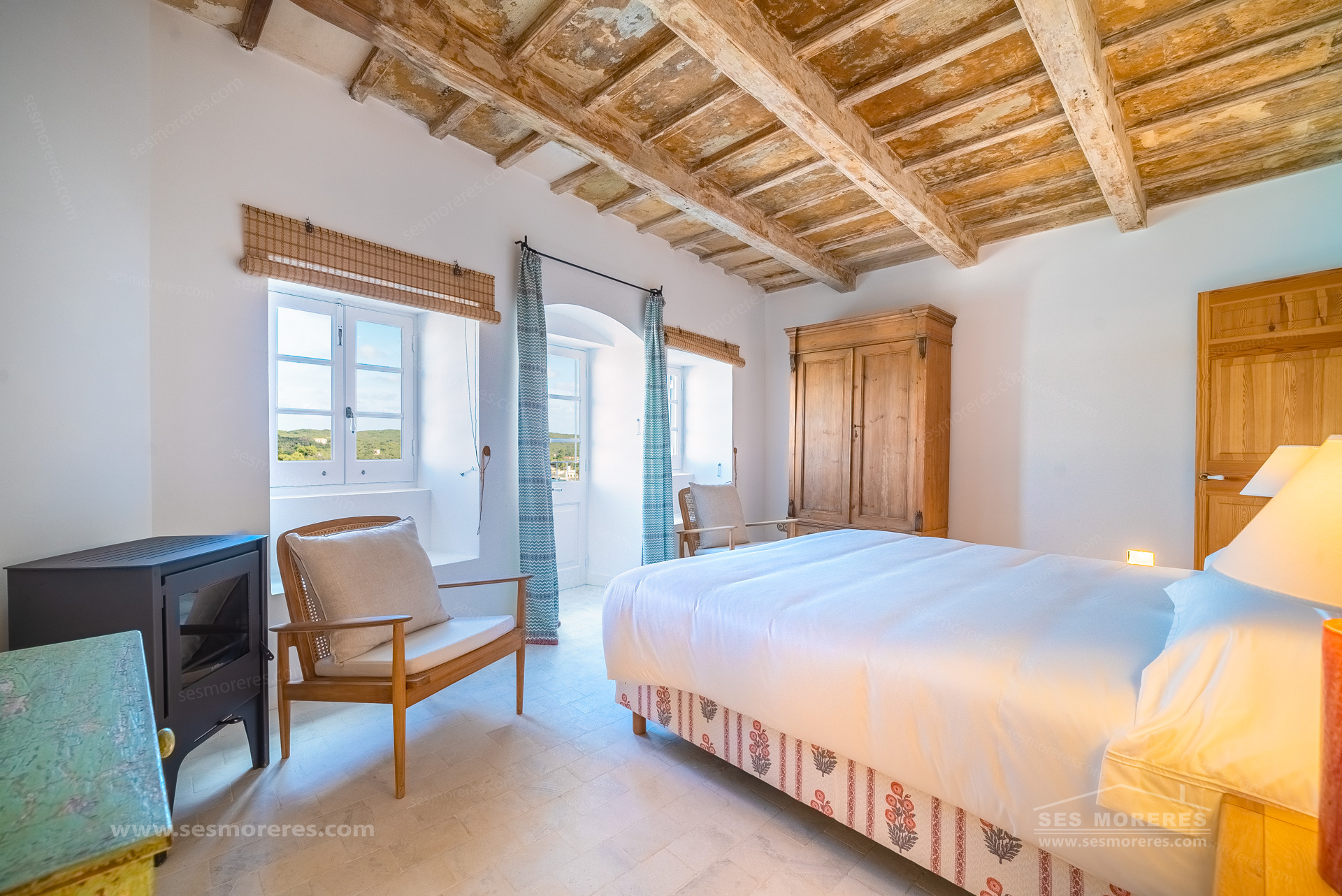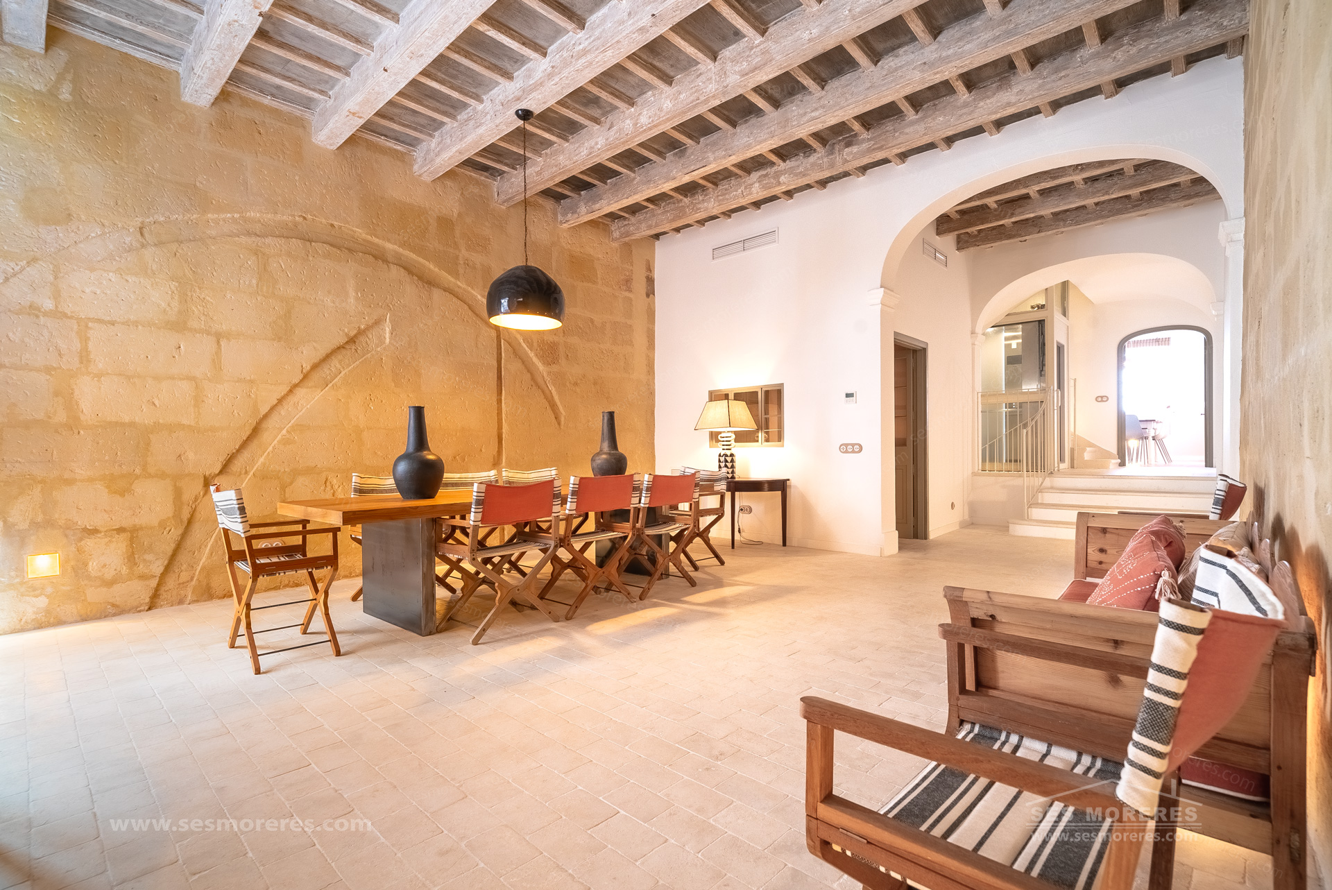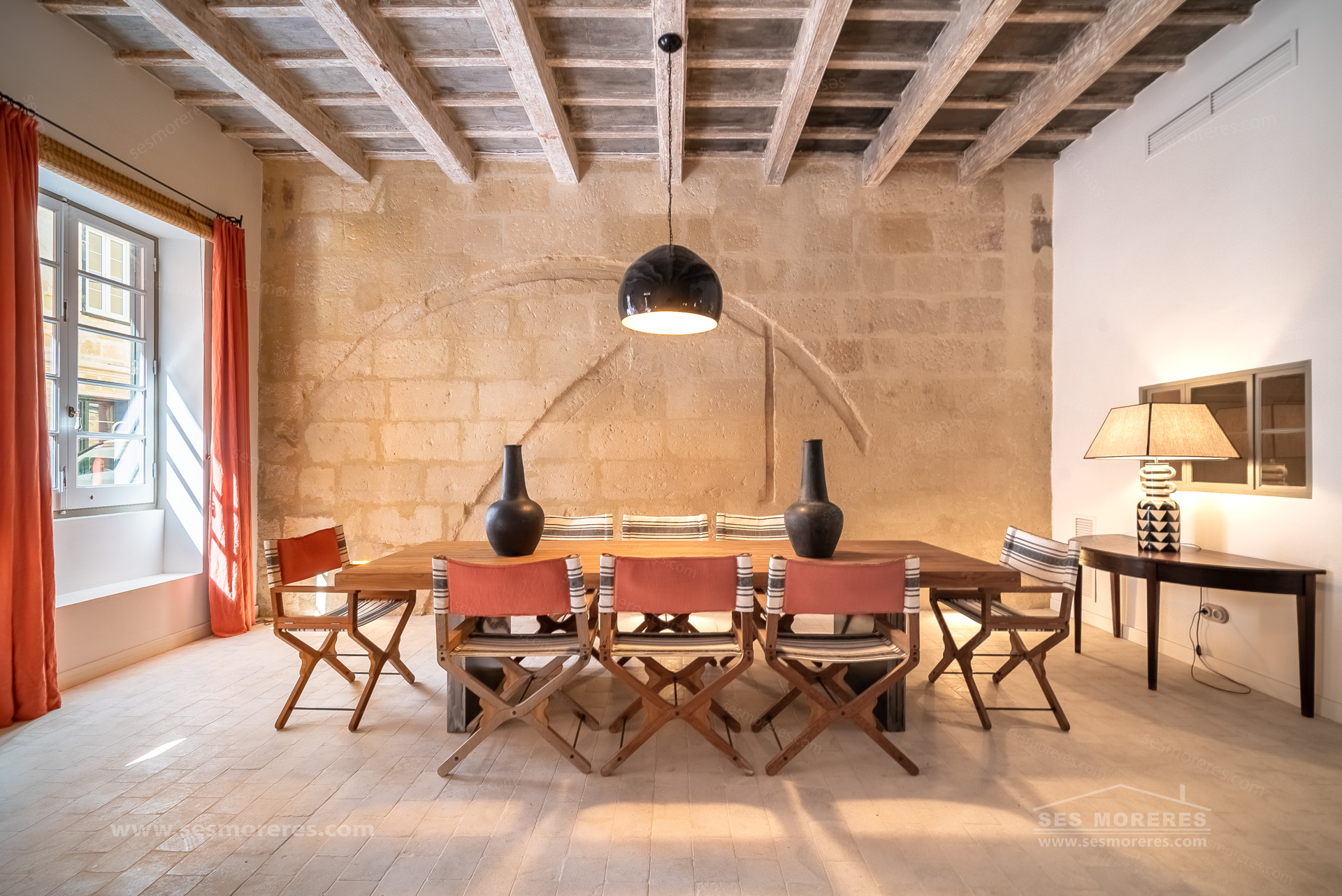 The renovation has respected the charm and architectural heritage of the large Menorcan town houses: with original encaustic tile floors, marés limestone walls, high ceilings with wooden beams, restored carpentry, and decorative cornices. Some ceilings retain original period frescoes, adding a unique artistic and historical touch to the sophisticated home environment.