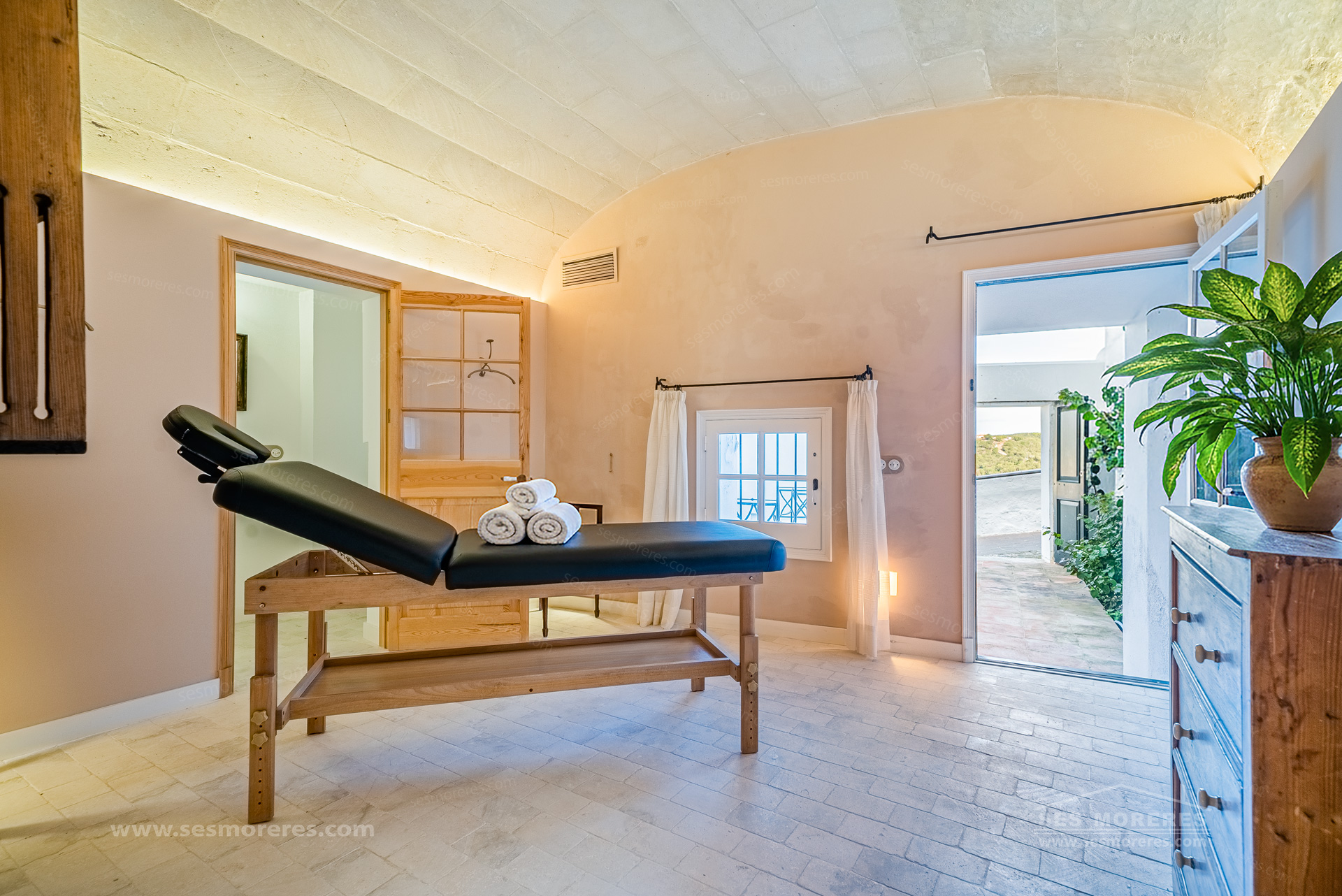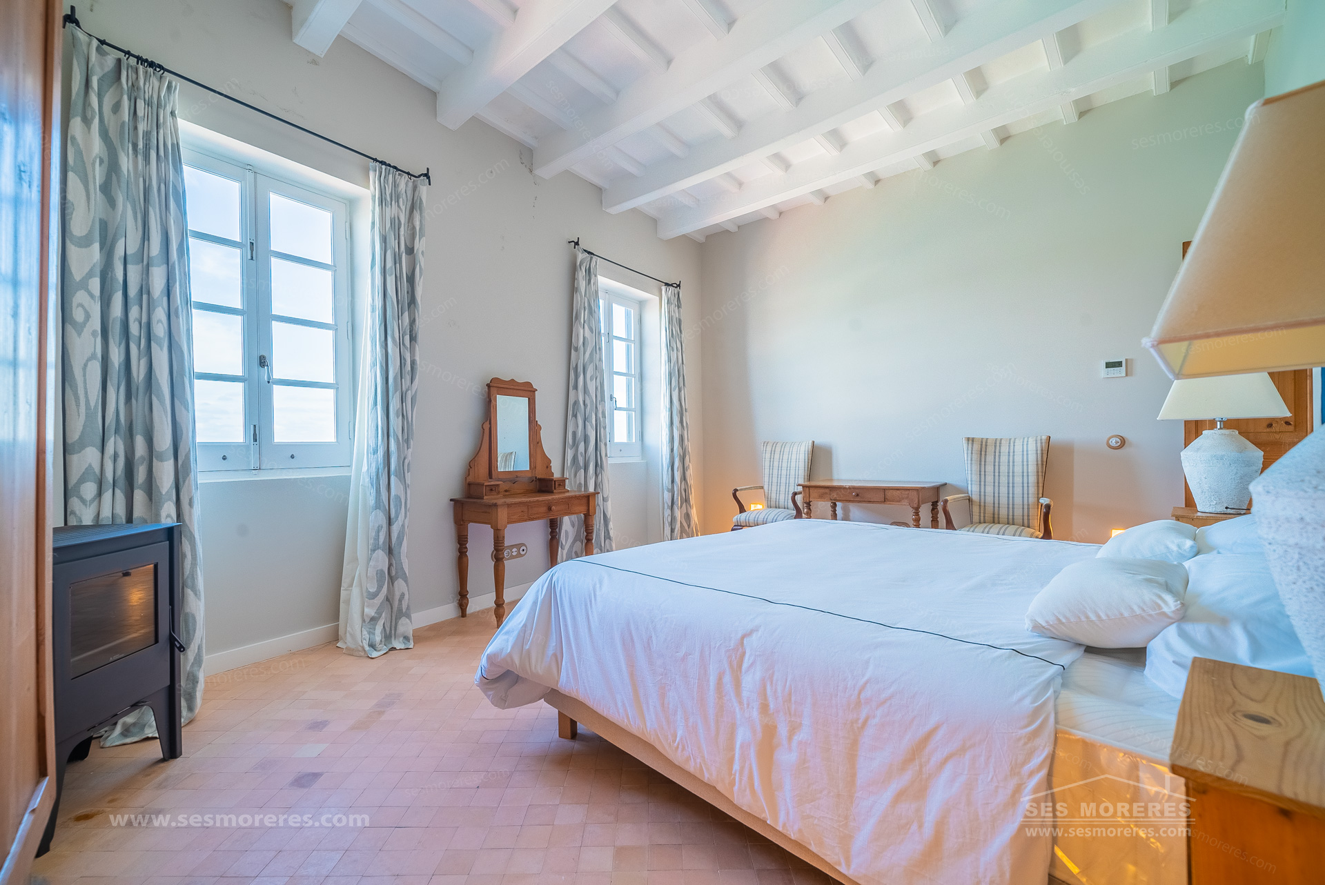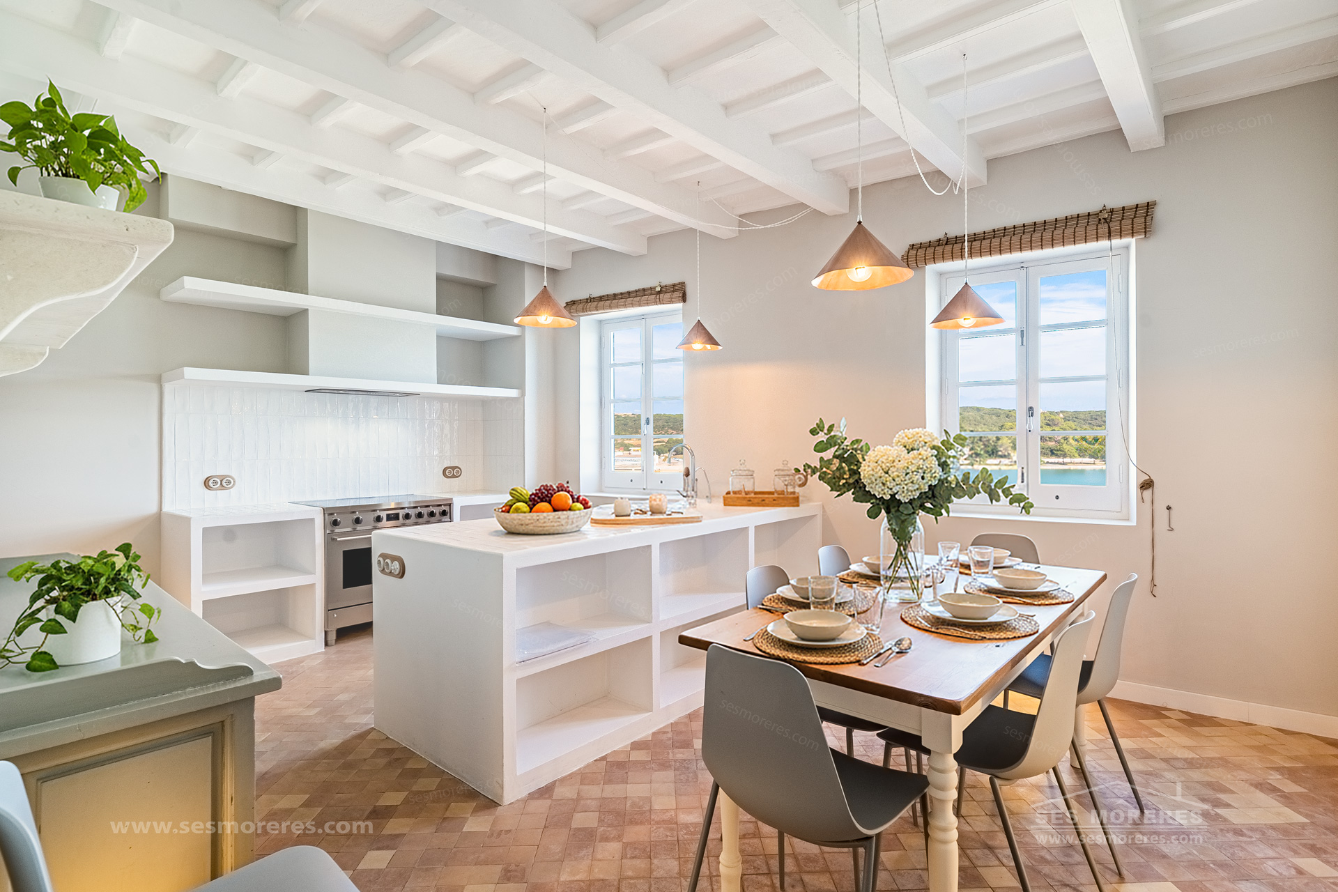 The renovation has respected the charm and architectural heritage of the large Menorcan town houses: with original encaustic tile floors, marés limestone walls, high ceilings with wooden beams, restored carpentry, and decorative cornices. Some ceilings retain original period frescoes, adding a unique artistic and historical touch to the sophisticated home environment.