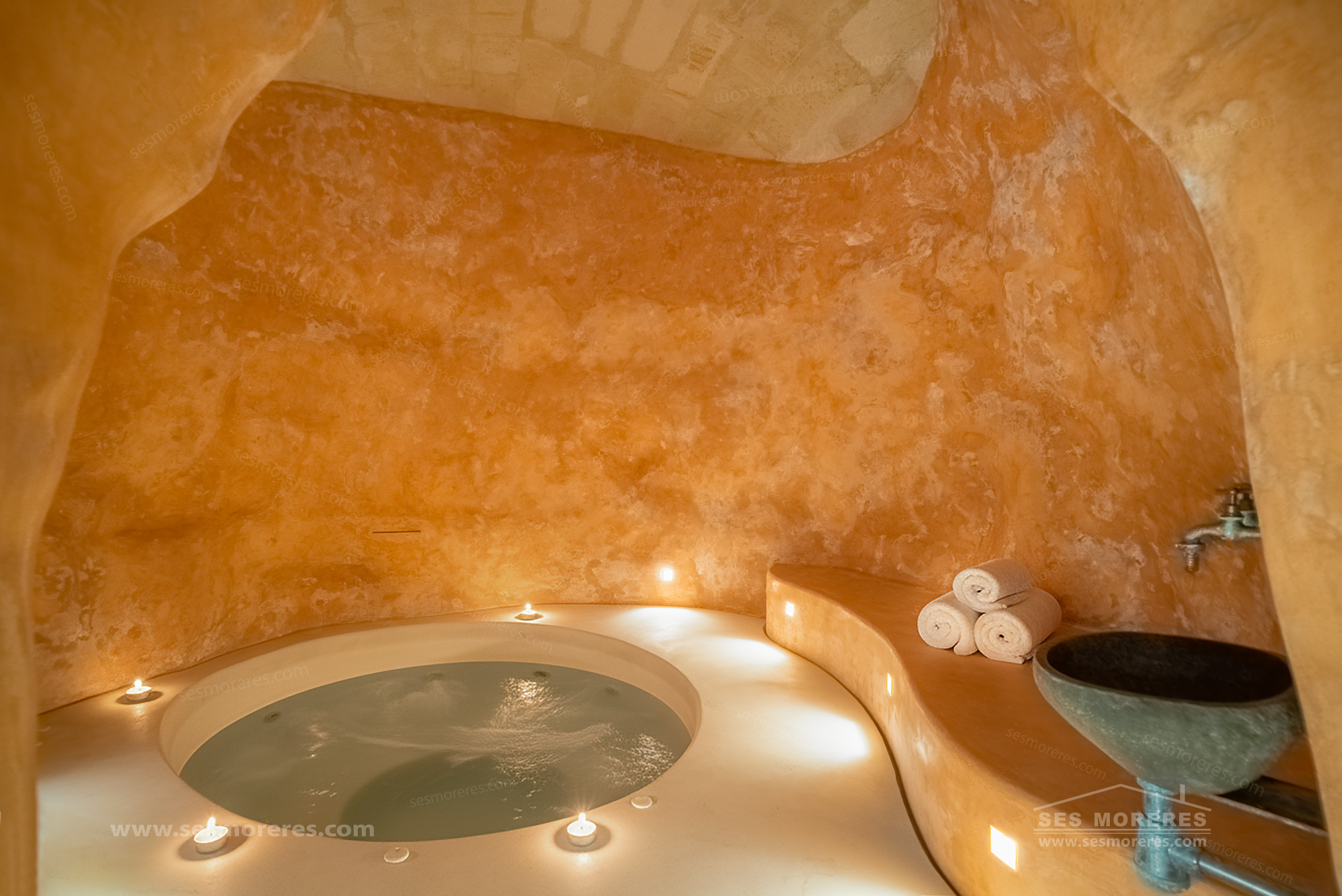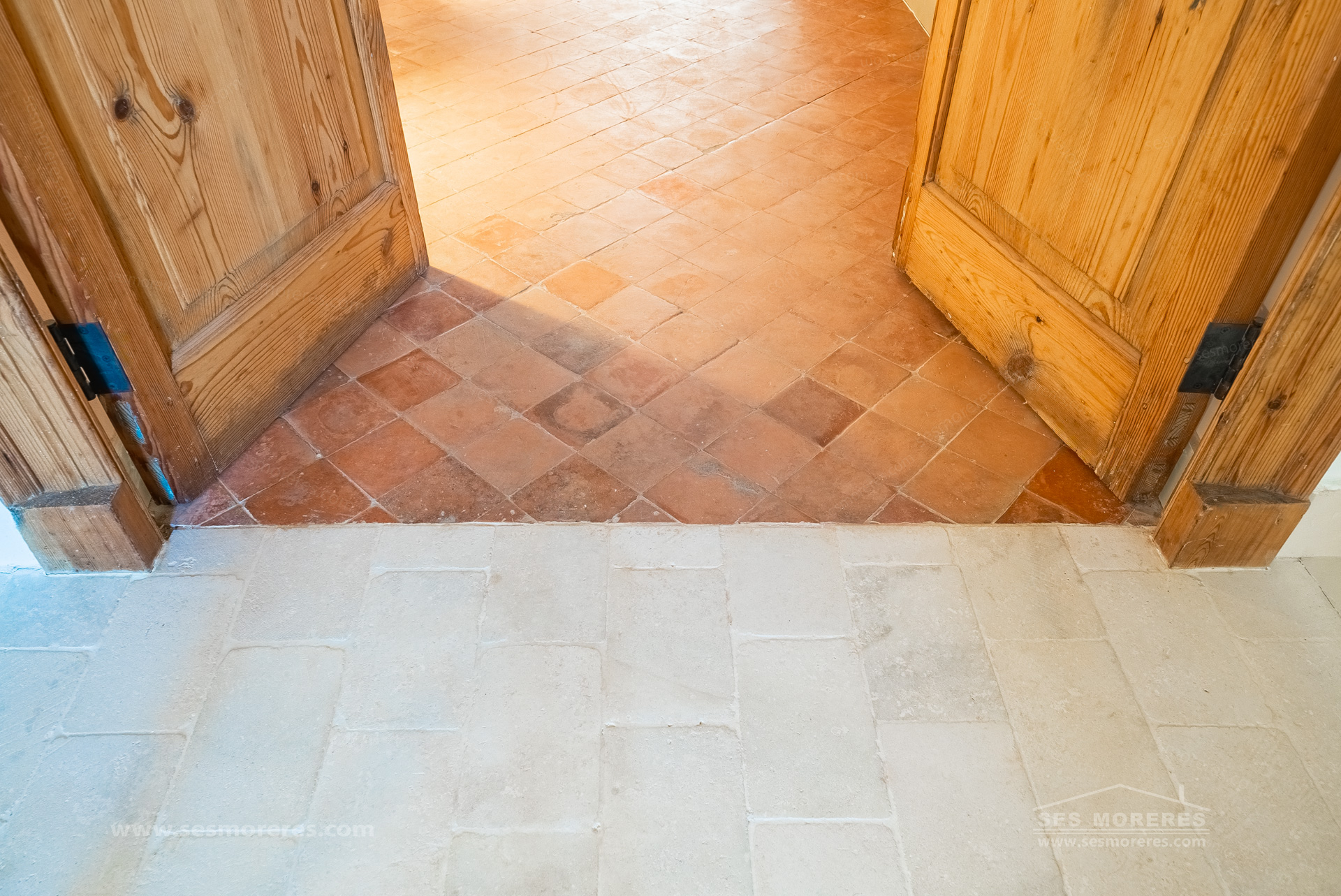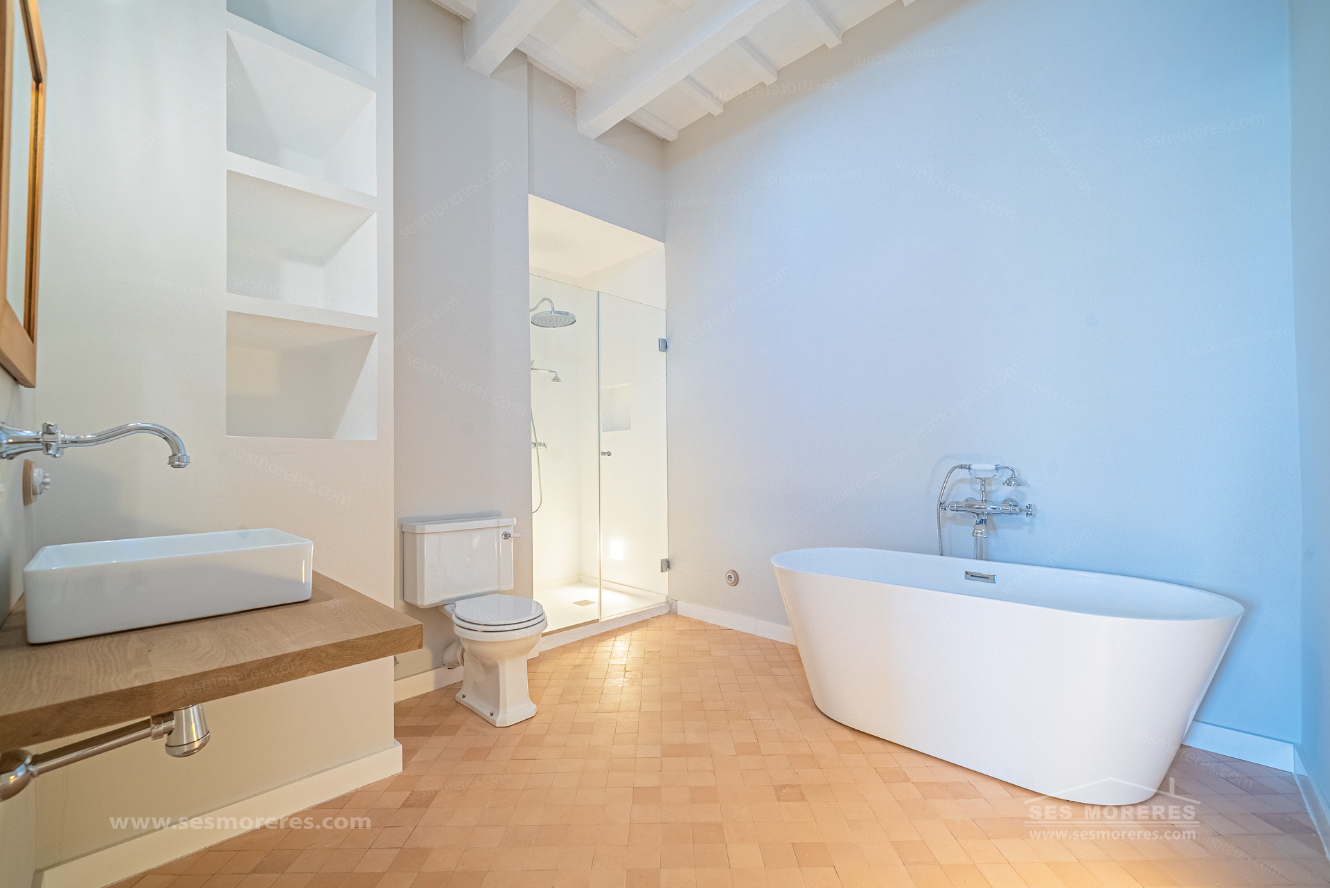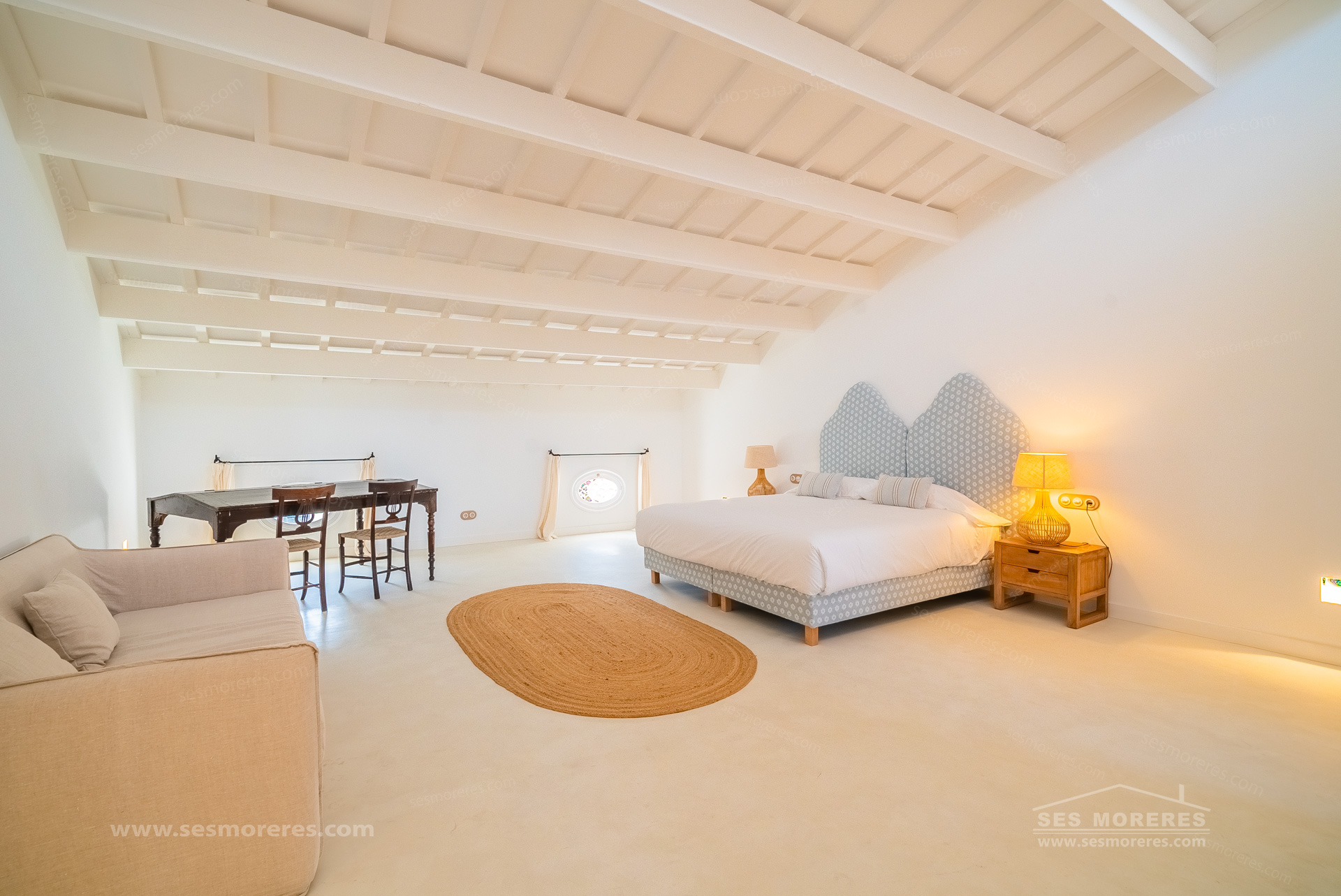 The renovation has respected the charm and architectural heritage of the large Menorcan town houses: with original encaustic tile floors, marés limestone walls, high ceilings with wooden beams, restored carpentry, and decorative cornices. Some ceilings retain original period frescoes, adding a unique artistic and historical touch to the sophisticated home environment.