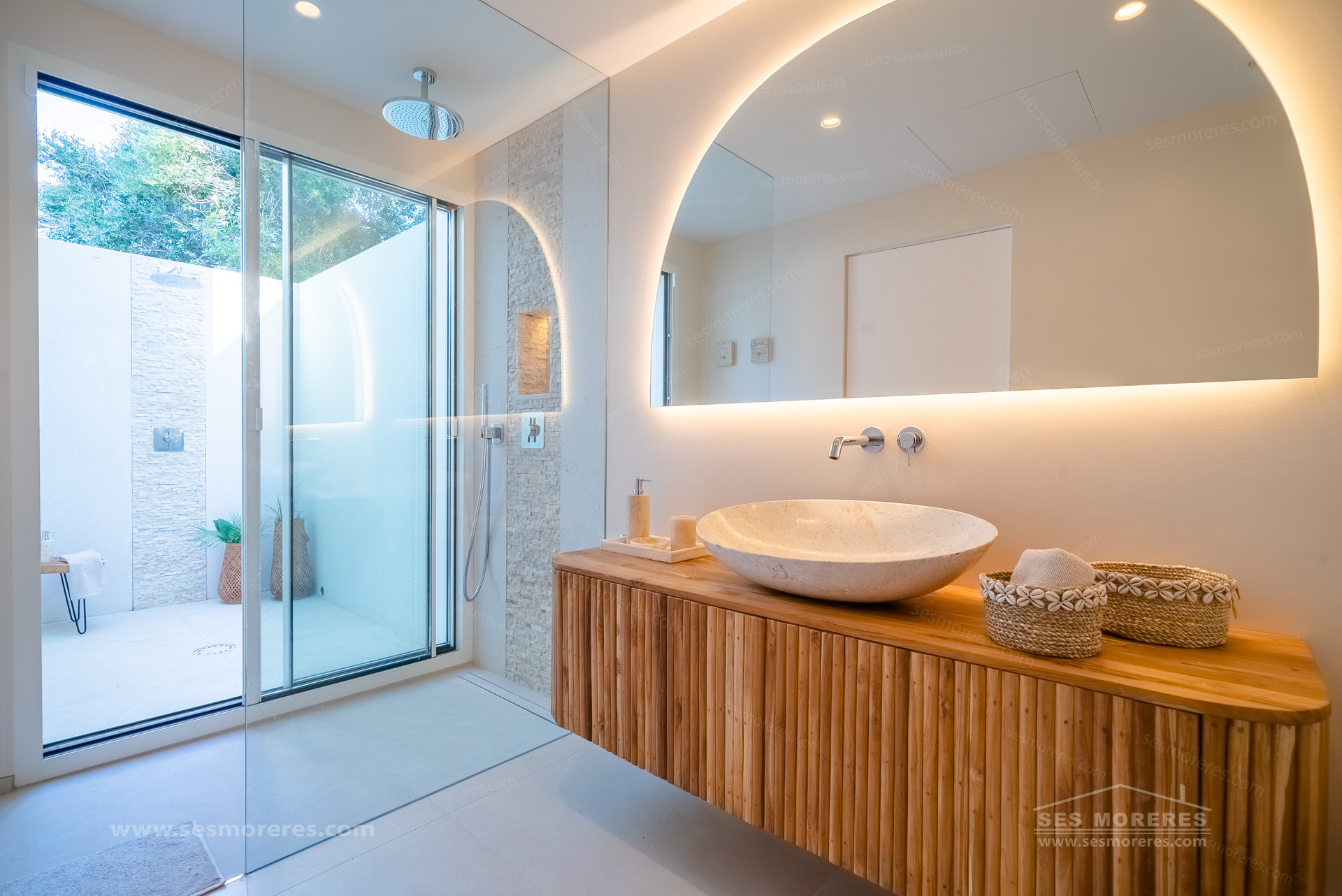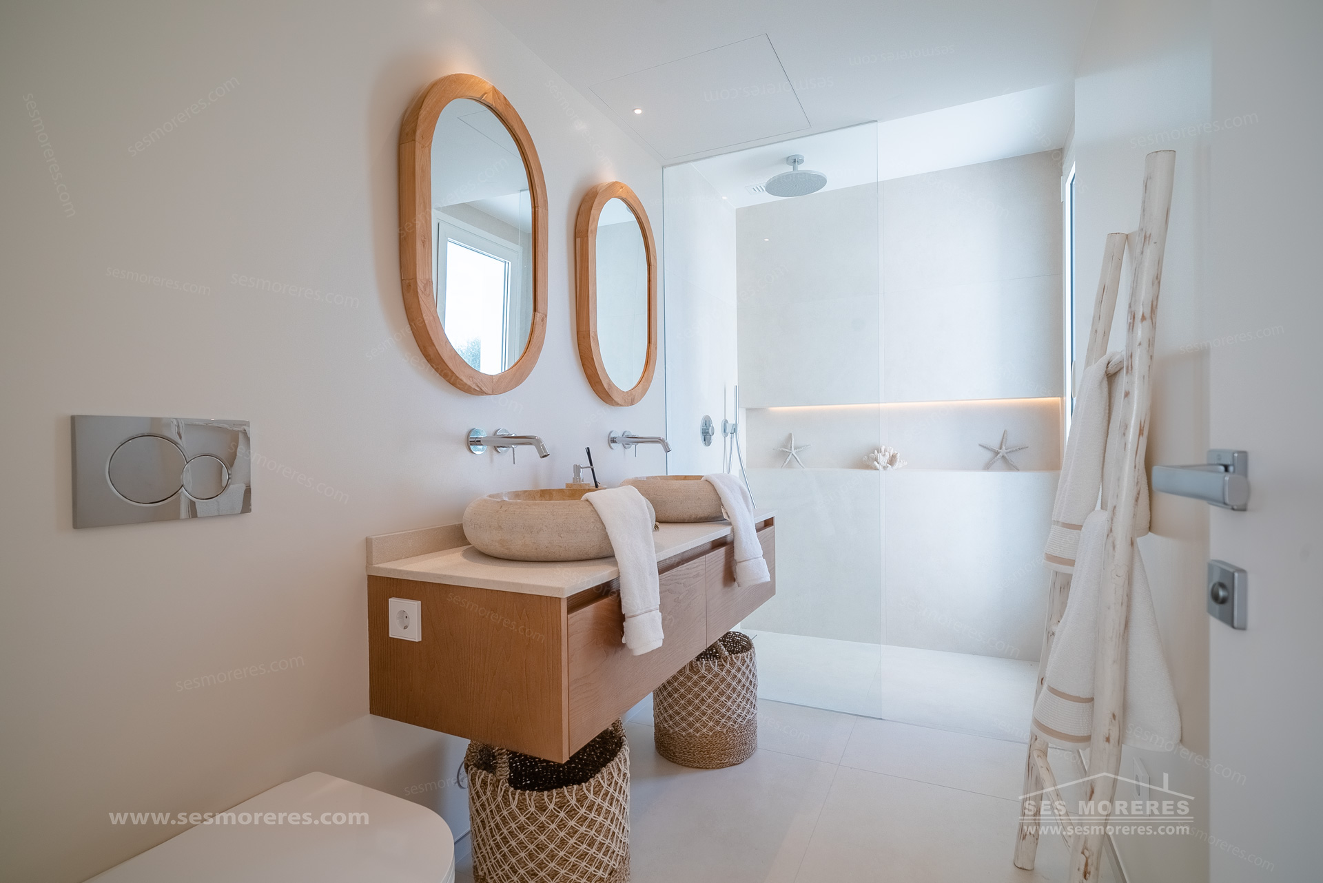 Every element of the property has been carefully designed to achieve a perfect harmony between architecture and natural surroundings. Flooded with natural light, the open-plan living and dining area, with a fully equipped modern kitchen, constitute the heart of the home, effortlessly integrating indoor and outdoor spaces.