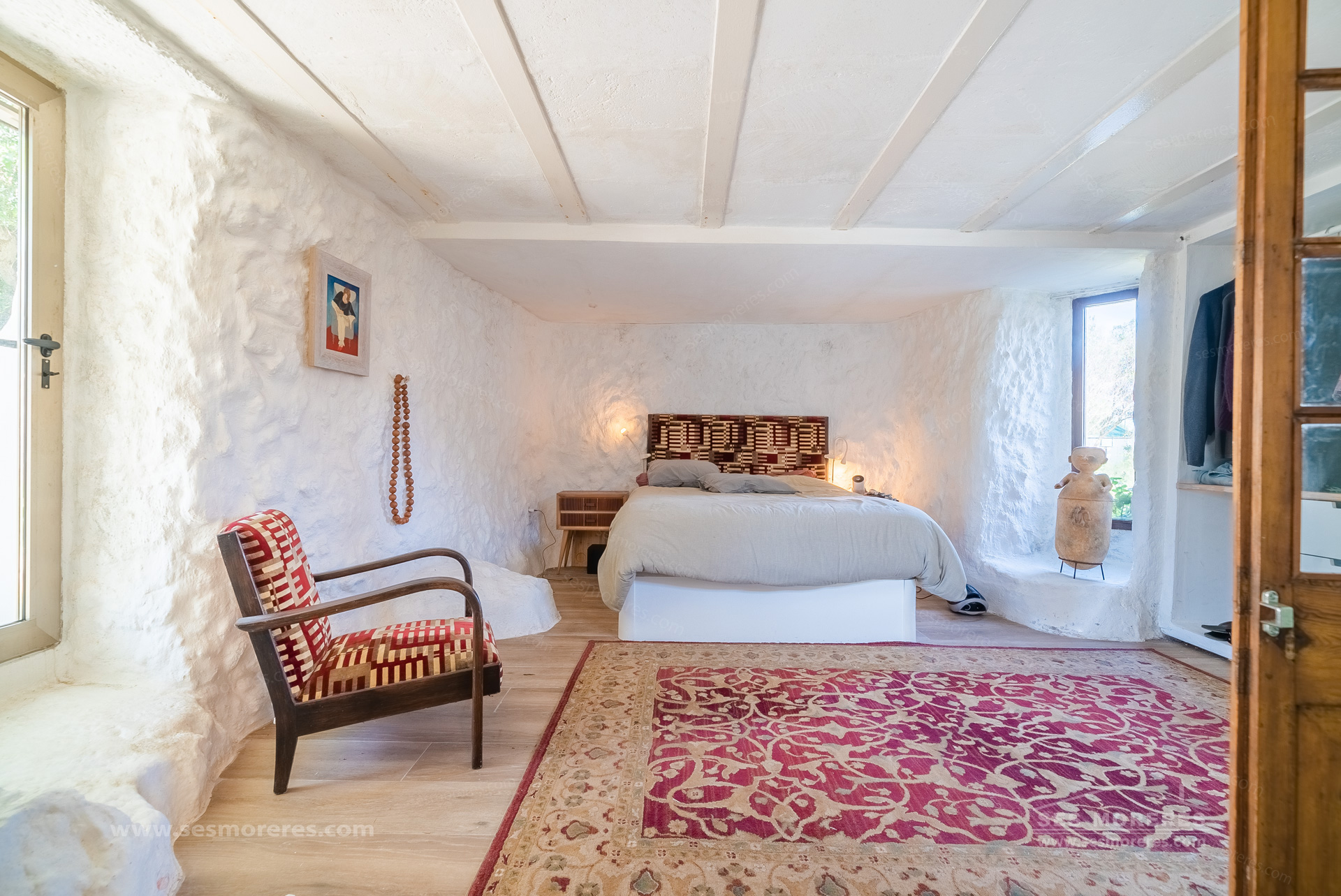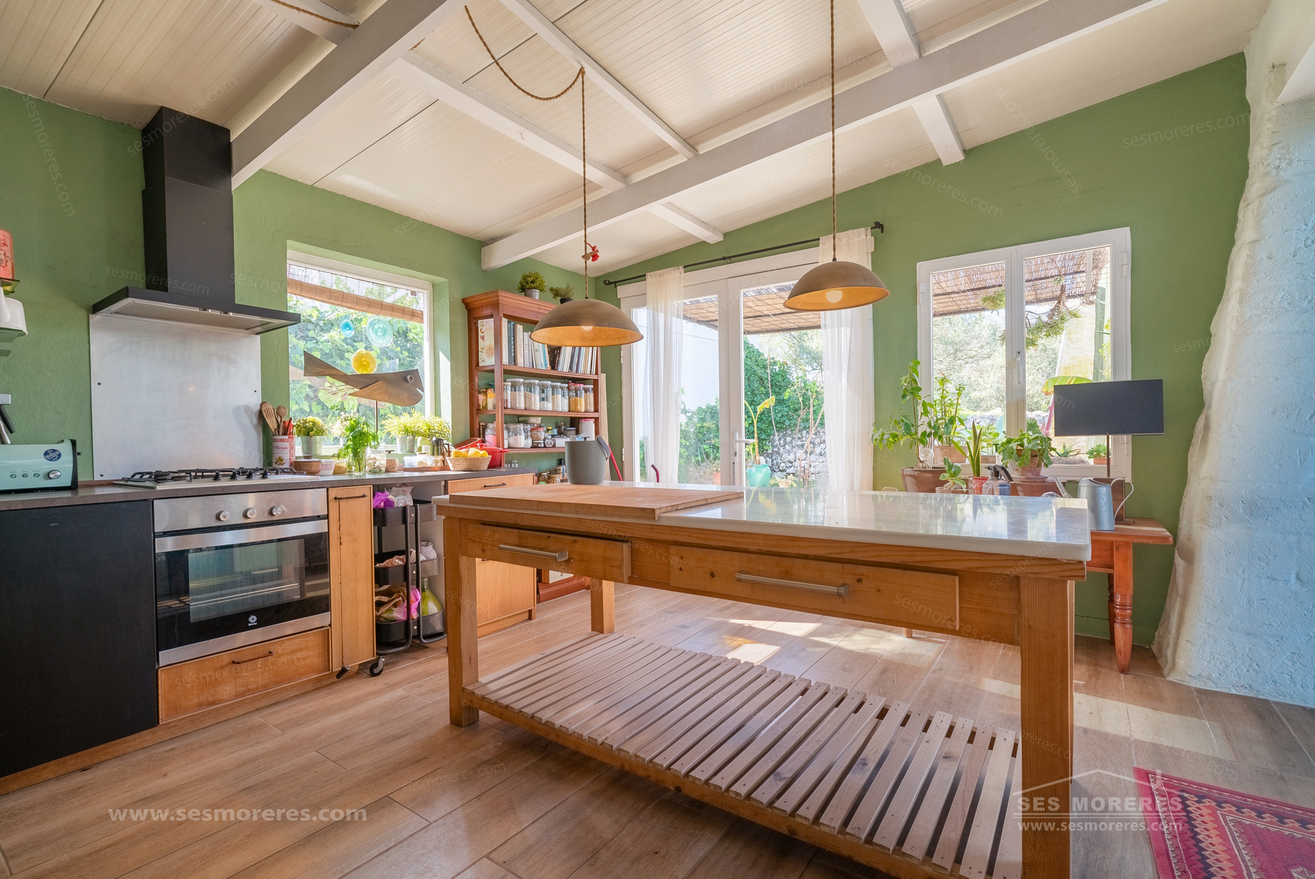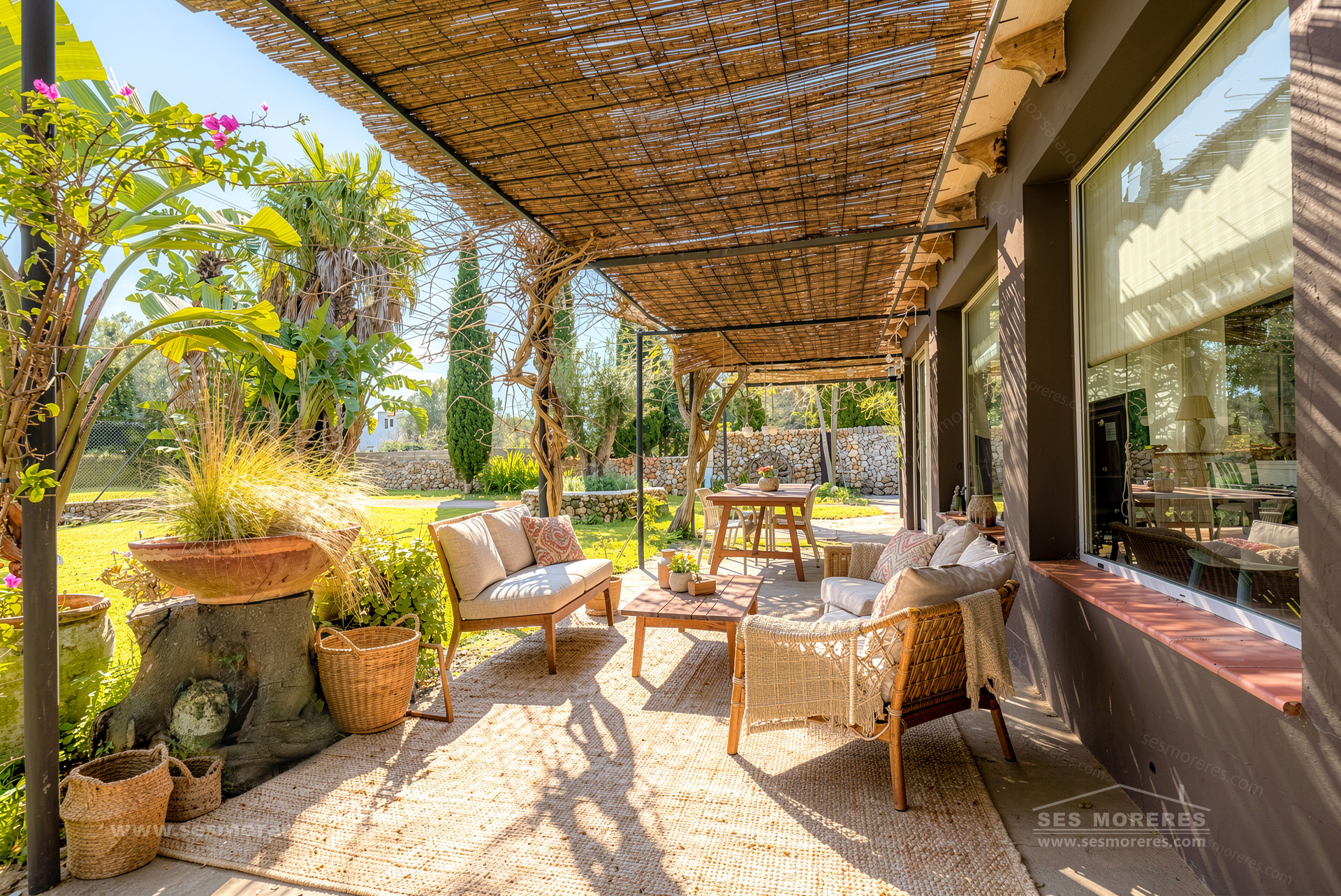 The main house is the most unique element. It is part of a traditional countryside construction reinterpreted with a modern and bohemian style approach, maintaining its essence but transforming the spaces with high ceilings, wooden beams with iron joints, and large windows that bring natural light and connect with the surroundings.