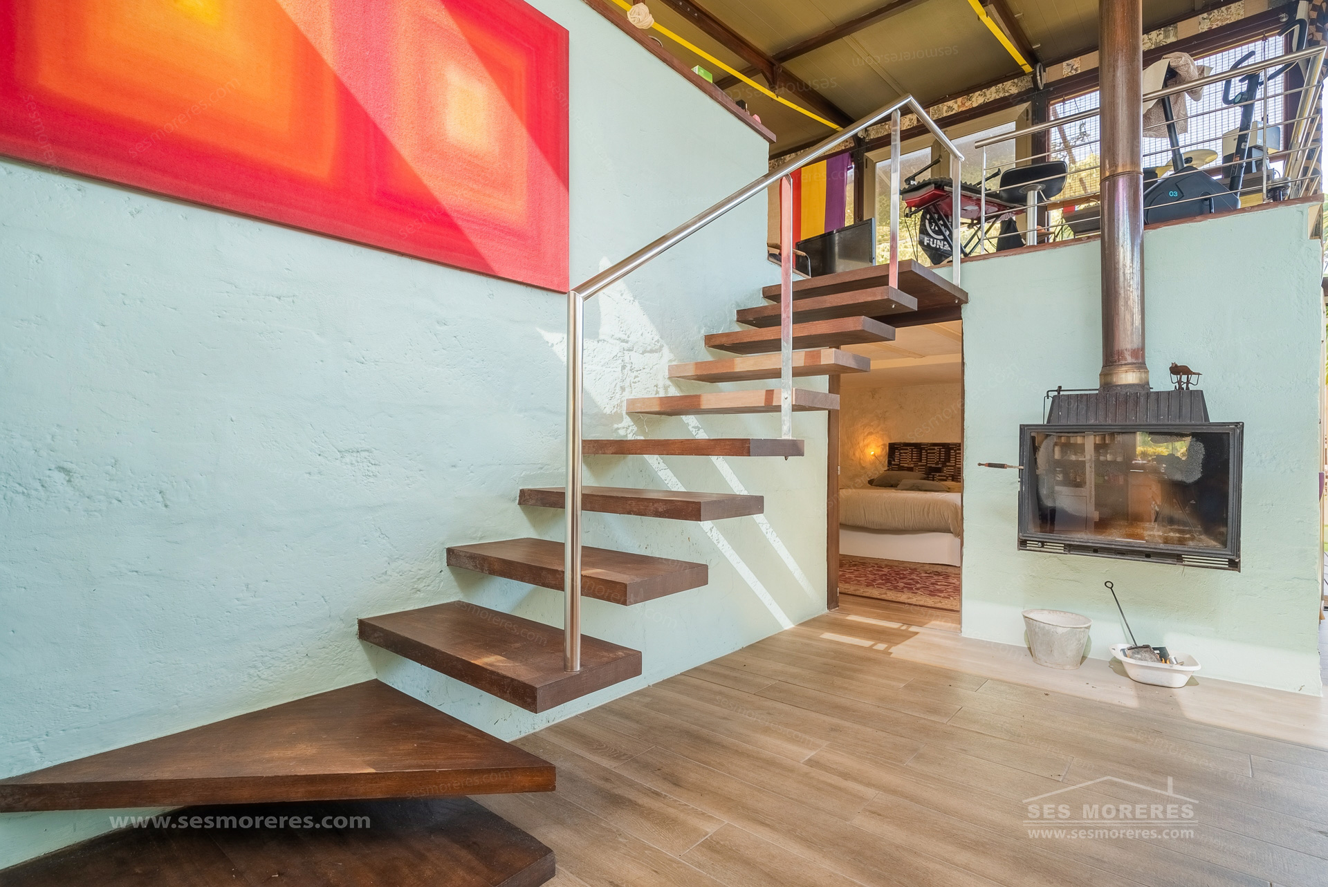 Inside, highlights include the floating fireplace, the cantilevered staircase, and the presence of natural stone, which in some areas emerges from the land itself and invades spaces like the master bedroom and its bathroom, integrating interior and exterior in a very organic way.