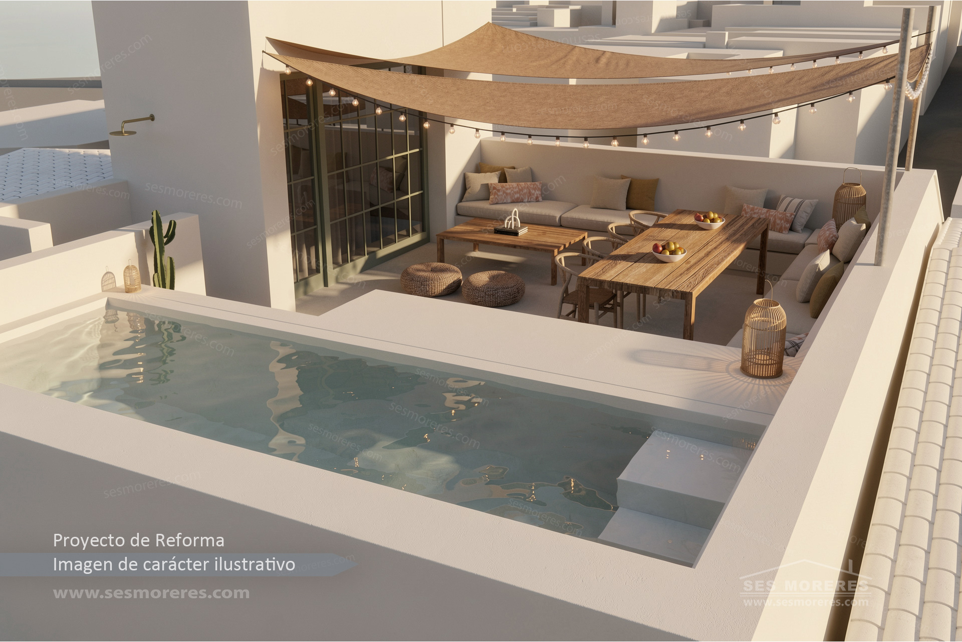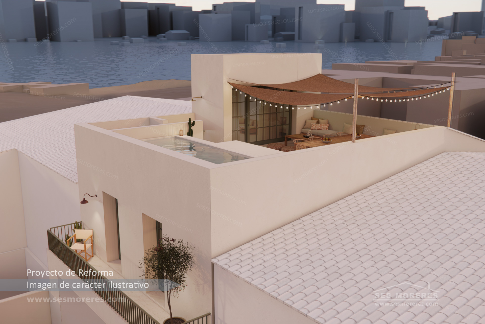 The great value of this house is that it has a valid building licence and is sold with an approved project for the construction of an additional floor with a roof terrace and a private pool. The pool permit has already been granted, an exceptional aspect at the present time, as new licences for building pools are not being granted in Mahón. The project includes the possibility of amplifying the house to six bedrooms, turning it into a spectacular family residence or a strategic investment in one of the most sought-after areas on the island.