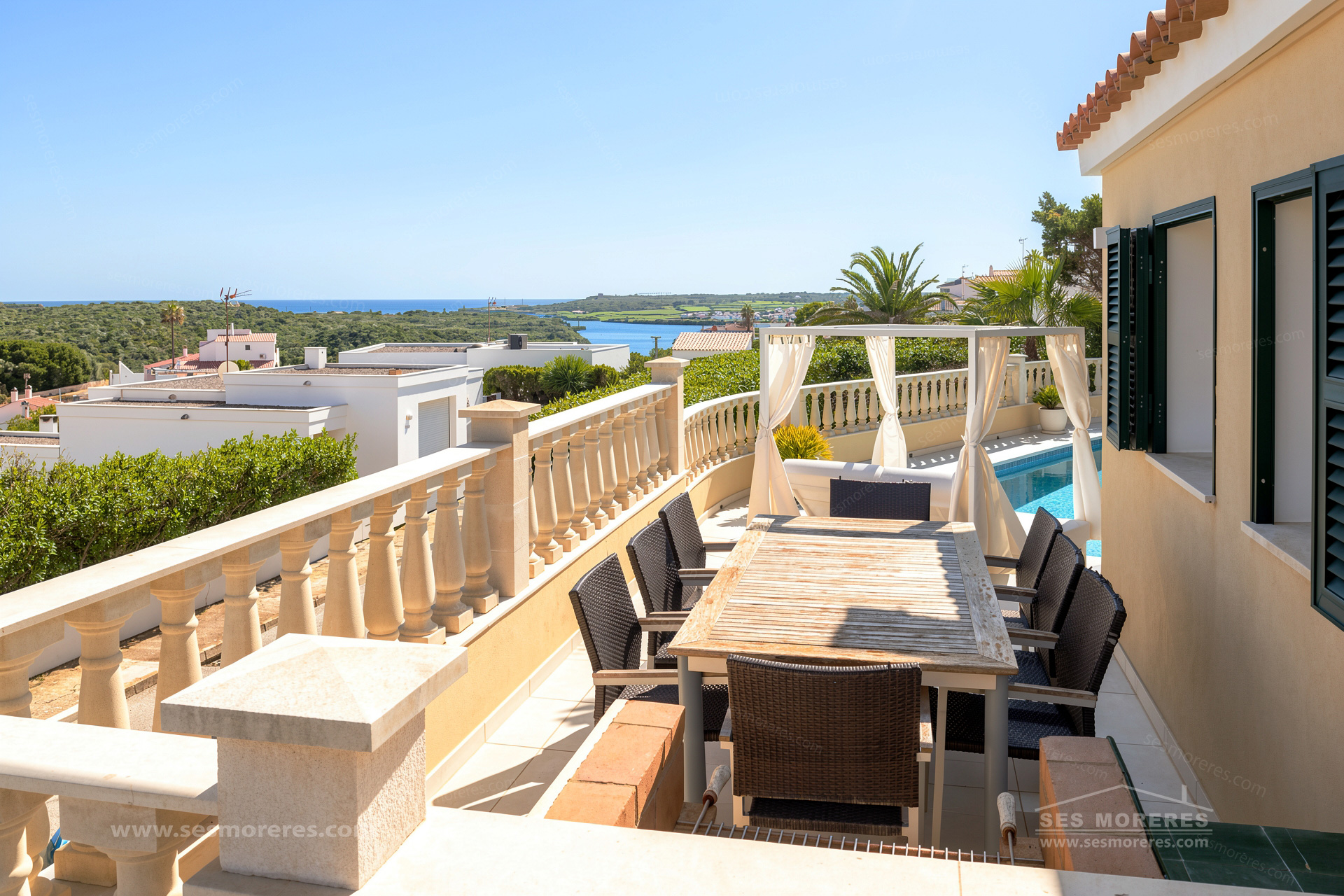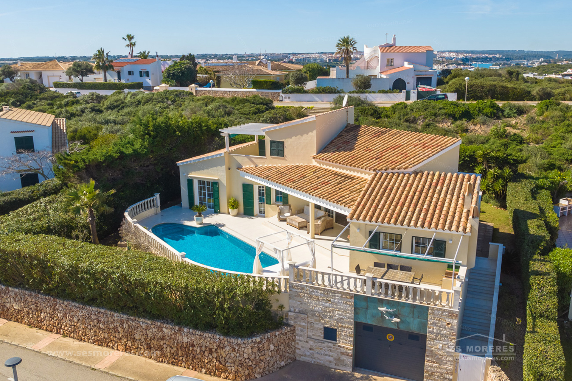 In a privileged residential area of Cala Llonga, this contemporary villa offers open views of the sea and the natural port of Mahón. With 228 m² built on a plot of 579 m², it combines functional design, modern comfort, and Mediterranean style.
